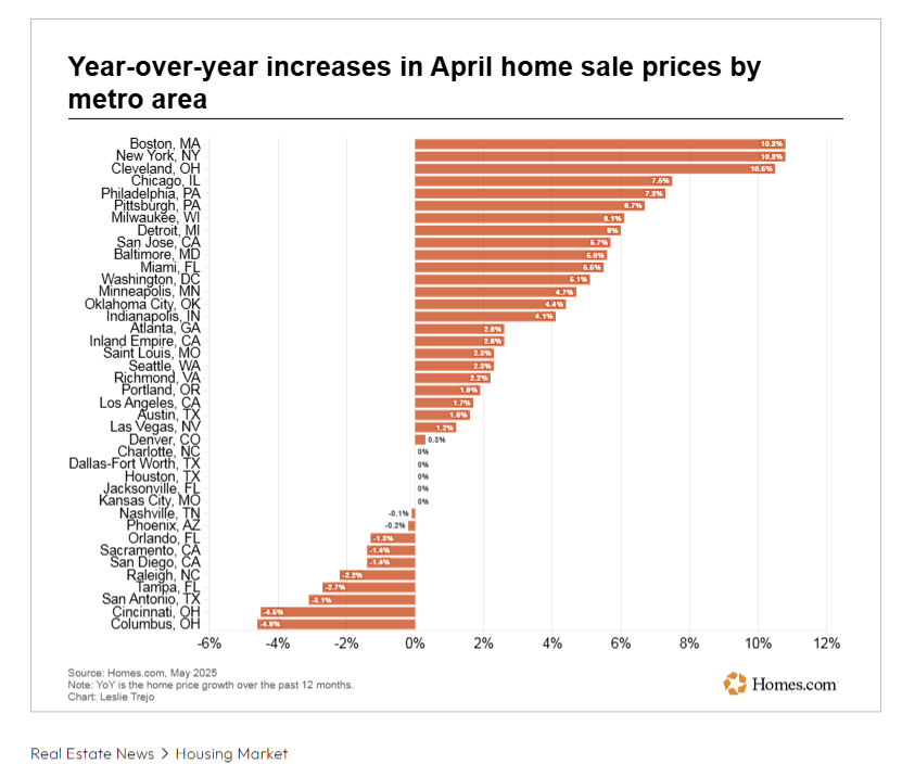 New York and Boston topped the list, each with a 10.8% increase in home prices compared to April last year. Cleveland saw a 10.5% increase, while Chicago home prices grew 7.5%.